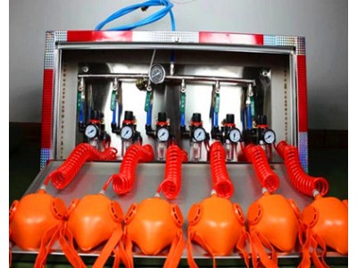 ZYJ-A型矿井压风自救装置,内装六个呼吸面罩联成一组,装在不锈钢的箱体内,组成一个井下自救系统,并由地面泵房供气。(瓦斯突出矿井安装多少个组,视其井巷规模,井下工作人员编制的多少而定,一般情况下,井下安呼吸器的个数不得少于井下全员的三分之一)。
