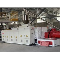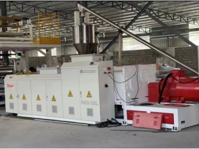 灰尘)、再自动上料到挤出机、由大板模具结构出料进行五辊定型模定型,排辊托架冷装置、裁边装置、牵引机、自动切割机、自动抬