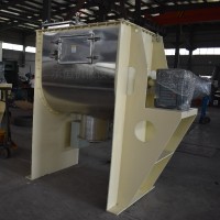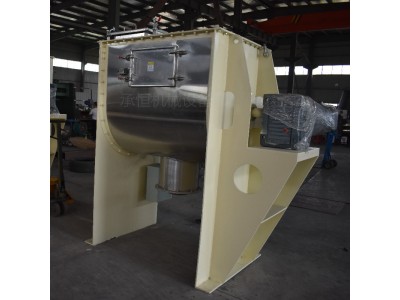 卧式螺带混合机可以有效率、快速的混合物料,在搅拌轴的螺旋带运动下使内外螺旋带在较大范围内翻动物料,内螺旋带将物料向内侧运动,外螺旋带将物料由两侧内向运动,使物料来回掺混,另部分物料被螺旋带推动下,沿轴向径向运动,从而形成对流循环,由于上述运动的搅拌,物料在较短时间内获得快速均匀混合。