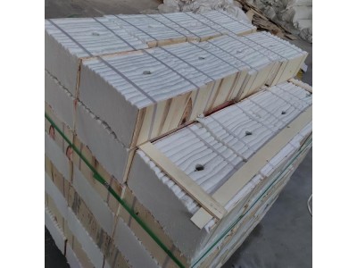 硅酸铝陶瓷纤维保温块是利用模块打制机把纤维毯根据规定的尺寸折叠压缩而成。压制完成后对规格尺寸及压缩比做二次修正,确保模块尺寸及容重大小。硅酸铝纤维保温块通过预埋在模块内部的锚固件与焊接在炉壳上的外置锚固件紧固在一起,使模块与炉壳钢板牢固的结合在一起。