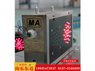 矿用本安型声光报警箱外壳上方有悬挂吊鼻,发光二极管为双色警示灯、双路输出,报警箱能发出红、绿两种颜色的光信号并伴有相应的警示语。