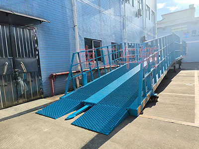 3. 尺寸:台面展开总长度17.5M,外宽3 M,平台高1.2M,护栏高度1.5M(10米平台上方两侧护栏设计为折叠式对开门结构,门打开后宽度为6.5米),桥面平台长度10M, 斜坡长度6M, 前过渡板长度0.5M,后过渡板长约1M;