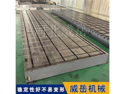振动试验(如新能源电池振动、电机性能测试)对试验台铁地板的抗振性要求高,定制核心围绕“抑共振、吸收冲击”展开。材质上优先选用QT600球墨铸铁,其阻尼性能优于普通灰铸铁,能吸收高频振动;结构设计采用“箱型封闭框架+蜂窝状筋板”,筋板间距加密至120-150mm,提升结构刚性,抗扭刚度≥7×10⁵N・m/rad,振动传递率≤5%。针对高频振动场景,可定制加装减振垫(厚度30-40mm,阻尼比≥0.1),或在台面底部增设阻尼层,进一步降低外部振动干扰。台面预留密集T型槽(槽宽16mm,间距50mm),搭配防松螺栓固定试验样品,定点精度≤±0.01mm,确保振动过程中样品无位移。新能源实验室定制的2000×3000mm试验台铁地板,在50-5000Hz振动测试中,数据重复性误差从±1.0%降至±0.3%,完全满足严苛试验要求。