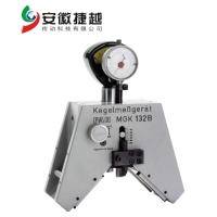 锥度规MGK132用于测量具有0°至6°锥角和90mm至360mm锥径的椎体外部。测量结果重复性低于1μm。将计量器放置在带有4个经硬化和抛光插脚的工件上。锥形物上的计量器位置由插脚和止块限定。所述止块装在计量器前方或后方。计量器具有两个可移动测量支架。一支架与小直径锥形物接触,另一个支架与大直径锥形物接触。在测量支架间有一固定间距。通过精密显示器,通过精密显示器,锥体直径与标称值的偏差可以在两个测量面内显示。利用参考锥设置计量器(一致有效)。